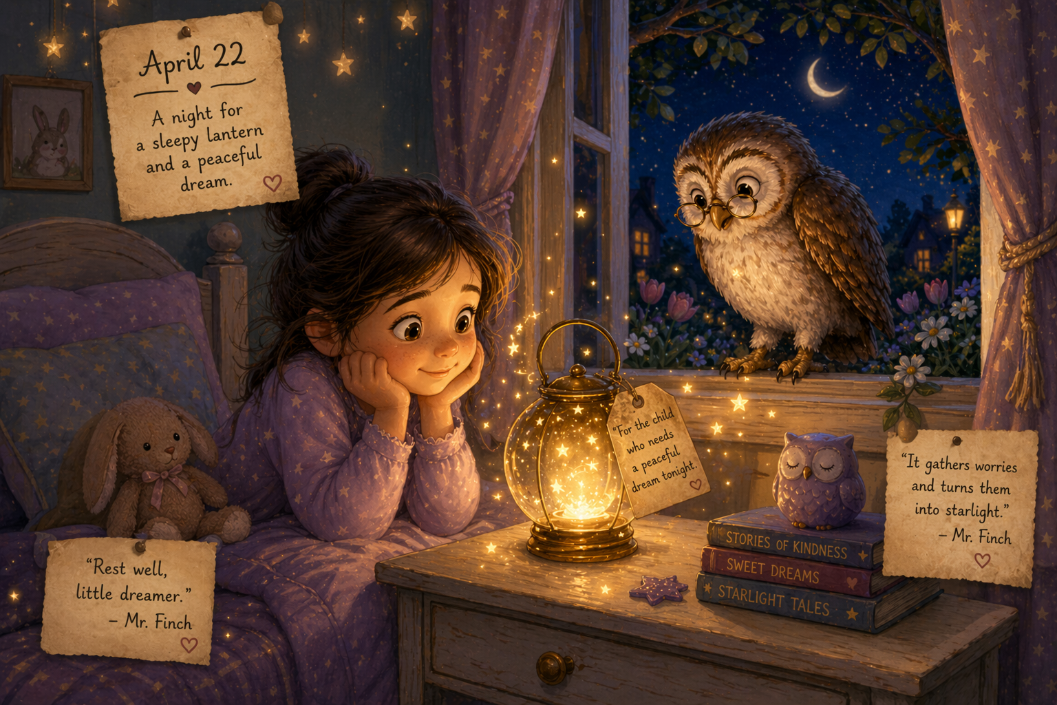 “No. At sunrise it returns to the sky, carrying peaceful dreams to other children.”Nora smiled, climbed into bed, and tucked herself in.The lantern swayed softly beside her like a sleepy firefly.Its warm light painted stars across the ceiling.As Nora drifted to sleep, she heard Mr. Finch call from outside:“Rest well, little dreamer.”And that night she dreamed of floating lanterns, moonlit gardens, and skies full of gentle stars.